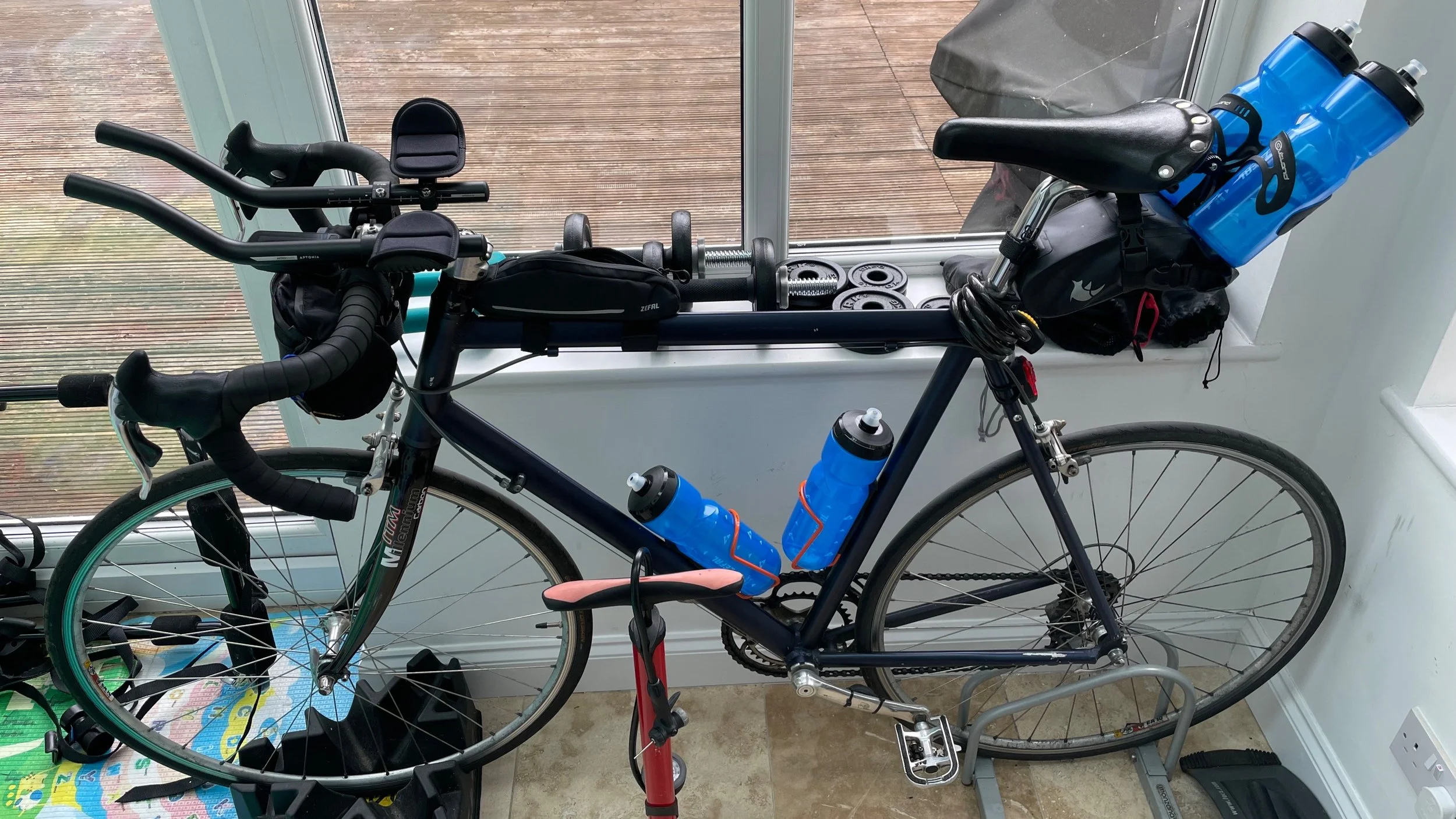 Bike Setup: My inherited [and somewhat antiquated] Ribble road bike, with the addition of Van Rysel tri-bars, quad water bottles, a Wahoo Elemnt Roam bike computer with the route programmed, Endura padded bike shorts, Nike Combat compression top, Wycombe Wanderers long sleeved training top and Salomon lightweight rain jacket, Lazer Blade+ helmet, Madison Code Breaker cycling glasses, Nike Super Rep cycling shoes with spd cleats and a few storage bags strapped to the frame for repair kit, nutrition, salt tablets and my phone [got to keep the masses updated eh?].
