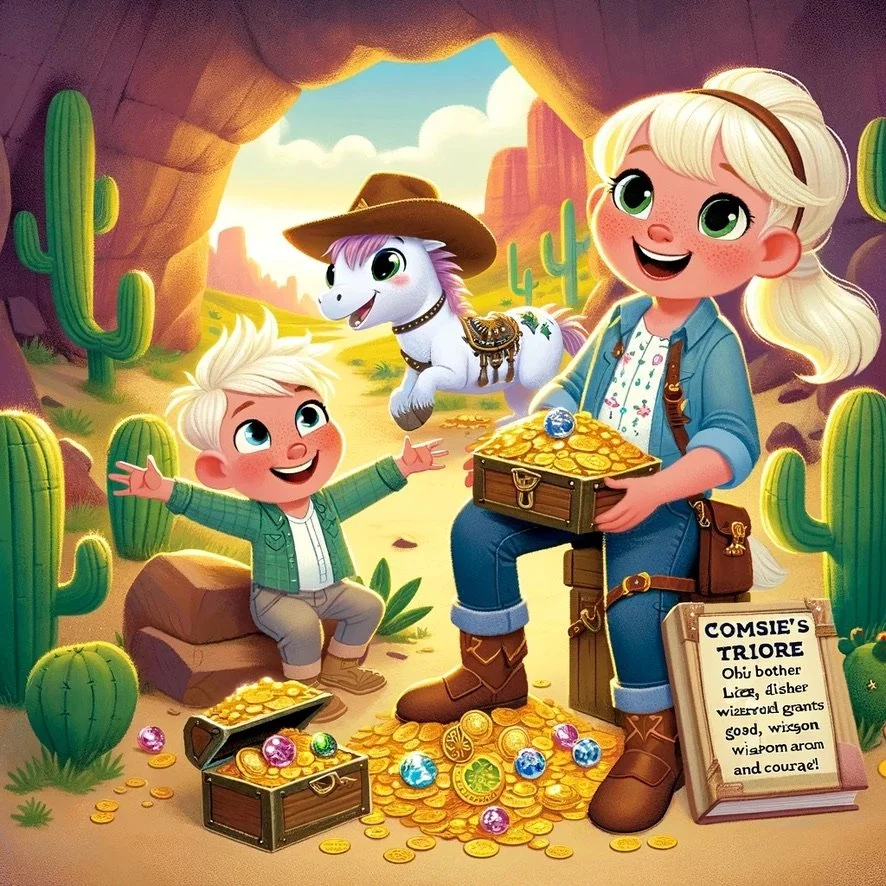 Determined to find the treasure and face the lizard, Connie and Obi set off on Sparklehoof, their trusty unicorn. They traveled through forests and over mountains until they reached the arid and mysterious Cactus Canyon.